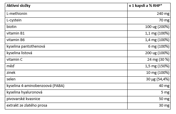 L- methionin, extrakt z natě přesličky rolní, L- cystein, pivovarské kvasnice, kyselina 4-aminobenzoová, citrát zinečnatý, extrakt ze semen zlatého prosa, extrakt z pšeničných klíčků, kyselina L-askorbová, extrakt z listů kopřivy, protispékavé látky - sodná sůl karboxymethylcelulózy, stearan hořečnatý, glukonát měďnatý, seleničitan sodný, pantothenát vápenatý, kyselina hyaluronová, pyridoxin hydrochlorid, thiamin mononitrát, kyselina listová, biotin.